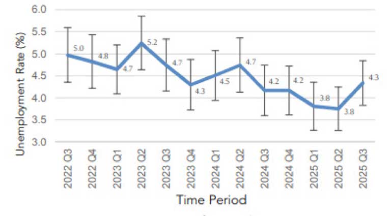 Sri Lanka’s unemployment rate increased to 4.3% in the third quarter of 2025, the highest since the third quarter of 2024, reversing the steady improvement seen earlier in the year, according to the Department of Census and Statistics’ Labour Force Survey.