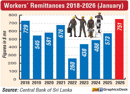 Sri Lanka’s workers’ remittances surged to a new high in January, with monthly inflows rising 31.1% year-on-year (YoY) to $ 751.1 million, as per the latest Central Bank of Sri Lanka (CBSL) data. This surpassed the previous monthly peak of $ 729.3 million registered in 2018 by 3%. However, January experienced a 17% decline compared with December 2025, reflecting seasonal variations in transfers.