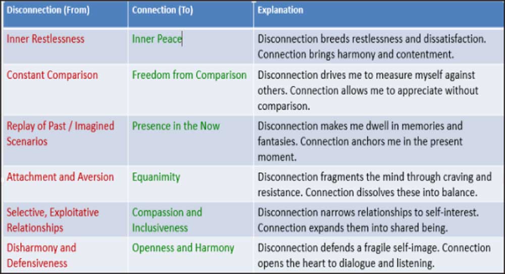 But the same human mind also holds the seed of transformation. When disconnection is observed without judgment, disturbances dissolve into insight. Desires and aversions weaken. In their absence, the sense of oneness shines forth. Actions motivated by oneness are simple, whole-centred, and sustainable.