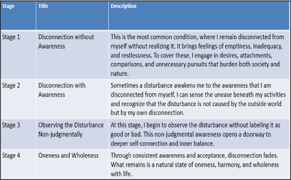 Thus, true sustainability is not only an external project but an inner awakening. By journeying from disconnection to connection, from separateness to oneness, we open the possibility of a sustainable world that arises from within.