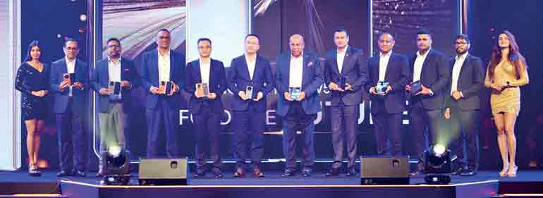 From left: Singer (Sri Lanka) Director Operations Jagath Perera, Marketing Director Janmesh Antony, Chief Operating Officer Vajira Tennakon, Honor Sri Lanka General Manager Zeng Lexing, Honor President – Southeast Asia Region George Zheng, Hayleys Group of Companies Chairman Mohan Pandithage, Singer (Sri Lanka) Group Managing Director Mahesh Wijewardene, Commercial Director Thulitha Mendis, General Manager – Digital Products Tharaka Warnakulasuriya, and Senior Brand Manager Ranidu Silva