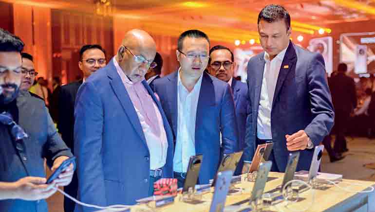 Hayleys Chairman Mohan Pandithage (left) inspects the Honor phone