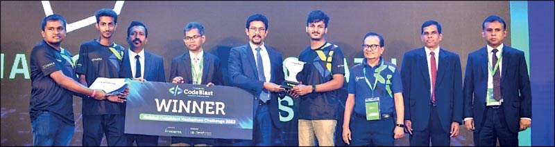 Digital Economy Deputy Minister Eng. Eranga Weeraratne presents award to winning team of Codeblast Hackathon 2025, Team X from University of Moratuwa joined by Digital Economy Ministry Acting Secretary Waruna Sri Dhanapala, SLT Group Chairman Dr. Mothilal De Silva, Telecommunication Regulatory Commission Sri Lanka Director General Rtd. Air Vice Marshall Bandula Herath, Mobitel COO Sudharshana Geeganage, and SLT-Mobitel CMO Prabhath Dahanayake