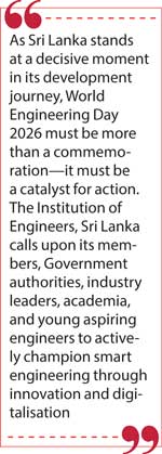 As Sri Lanka stands at a decisive moment in its development journey, World Engineering Day 2026 must be more than a commemoration—it must be a catalyst for action. The Institution of Engineers, Sri Lanka calls upon its members, Government authorities, industry leaders, academia, and young aspiring engineers to actively champion smart engineering through innovation and digitalisation. Let us commit to strengthening our technical capacities, investing in research and digital tools, shaping forward looking policies, and upholding the highest professional standards. By working together and taking bold, coordinated steps today, we can transform ideas into impact, build resilient and intelligent infrastructure, and secure a truly sustainable future for Sri Lanka.