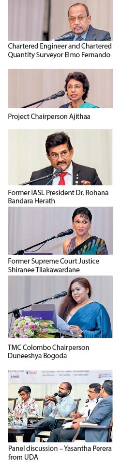 Panel discussion (from left): Saliya Wikramasinghe, Elmo Fernando, Dr. Rohana Bandara Herath, Project chairperson: Ajithaa Edirimane, former Supreme Court Justice Shiranee Tilakawardane, Natalie Warawita, Yasantha Perera from UDA, Colombo Municipal Council Assistant Fire Chief W.U. Dayananda, and moderator Mahesh Senanayake