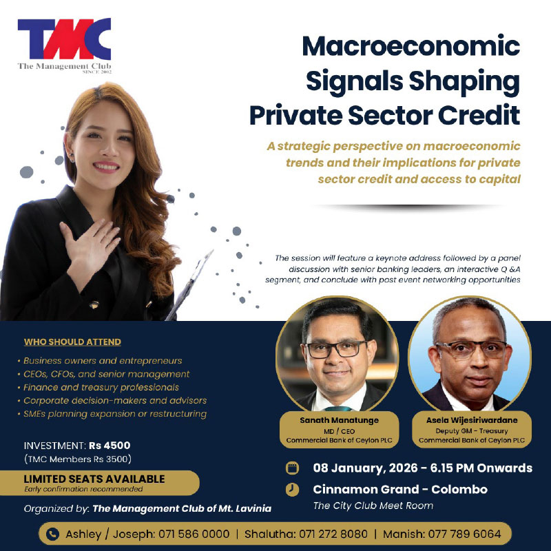 The Management Club (TMC) Mount Lavinia will host an executive forum titled “Macroeconomic Signals Shaping Private Sector Credit” on 8 January 2026 at the Cinnamon Grand Colombo, as part of its ongoing initiative to support and strengthen Sri Lanka’s management community.