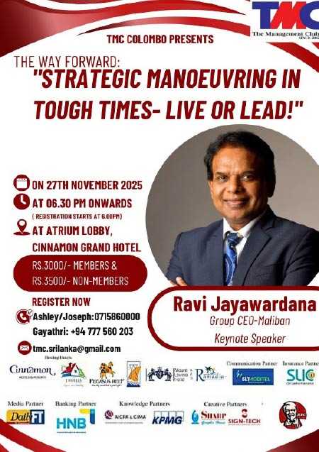 The Management Club (TMC) – Colombo Chapter presents “The Way Forward on ‘Strategic manoeuvring in tough times – Live or Lead!’, an inspiring knowledge-sharing session scheduled for Thursday, 27 November at 6 p.m. onwards at the Atrium Lobby, Cinnamon Grand Hotel, Colombo.