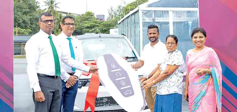 LOLC Holdings COO Kithsiri Gunawardenal (left), LOLC Finance Chairman Conrad Dias (second from left), and Browns EV CEO Pavithra Jayasekara (right) presenting keys to first BAW E7 customer