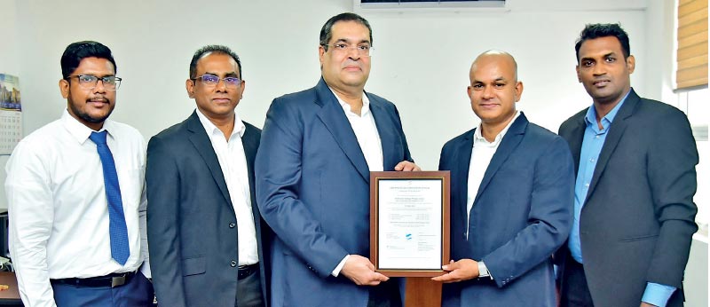 CEAT Kelani Managing Director/CEO Ravi Dadlani (centre) receives the ISO 14064-1:2018 certification from Control Union Inspections Managing Director Roshan Ranawake in the presence of representatives of the two organisations