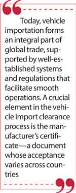 Authorities involved with import clearance processes are tasked with altering the regulations imposed on vehicle imports making it more flexible to suit the current trends and technologies. The issuance of manufacturer certification is fundamentally guided by the principles of the World Customs Organisation (WCO), which has established the Guidelines on Manufacturers’ Certificate, also referred to as the Certificate of Origin.