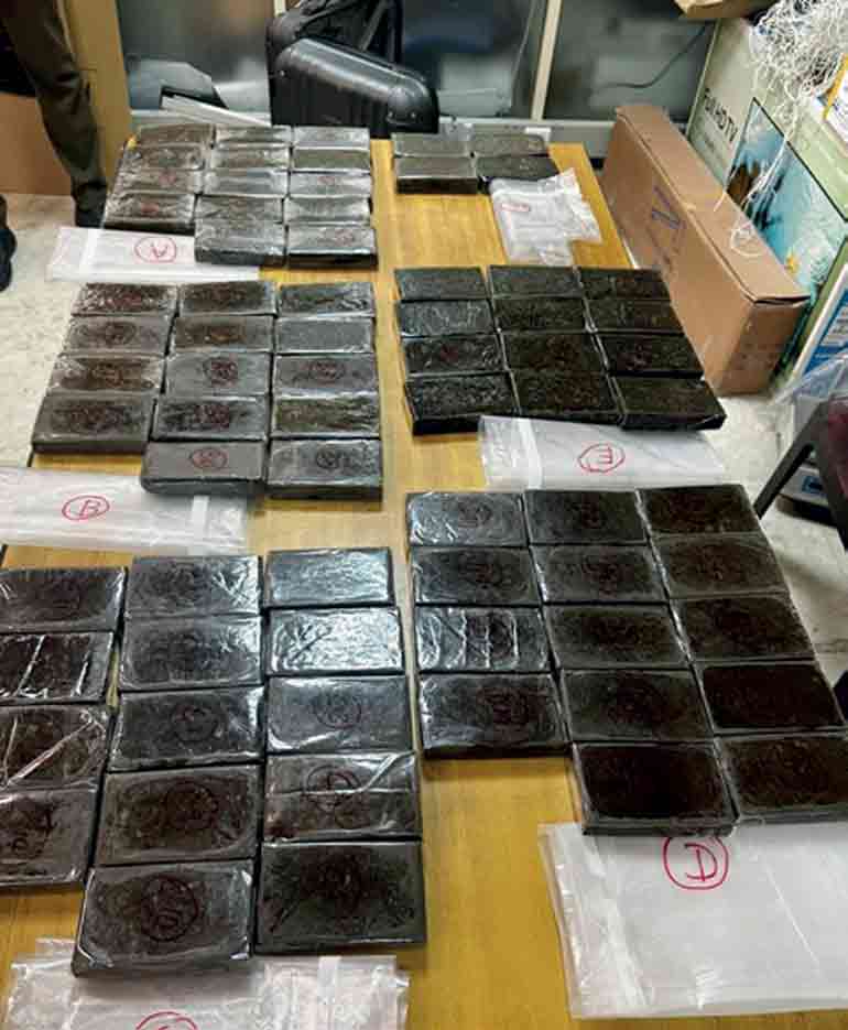The detection was made on Monday (27) at the Bandaranaike International Airport (BIA), when the suspect arrived from Dubai aboard Emirates flight EK 648, which landed around 10:30 p.m. Upon inspection, NCU officers found 18,253 grams (18.25 kg) of hashish carefully concealed inside the suspect’s checked-in luggage.