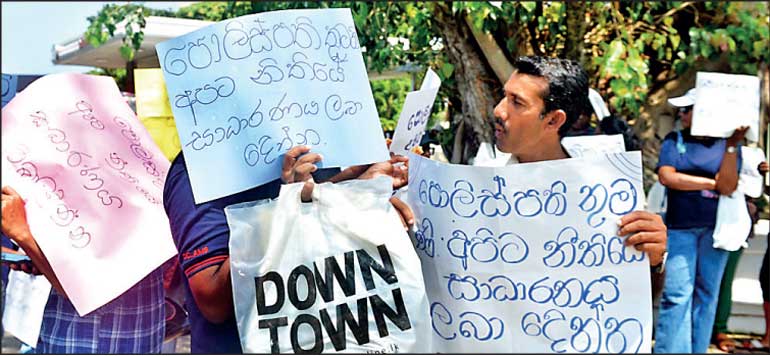 Depositors of the On Max DT pyramid investment scheme held a peaceful protest in front of the Police Headquarters yesterday, demanding the immediate release of the refund program for the depositors who have been aggrieved by their investments – Pix by Pradeep Pathirana
