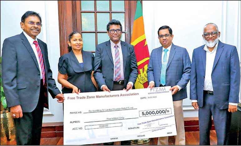The Free Trade Zone Manufacturers Association (FTZMA) has made a financial contribution of Rs. 5 million to the Government’s ‘Rebuilding Sri Lanka’ Fund, established to provide relief to those affected by the cyclone Ditwah. The cheque was presented on Thursday at the Presidential Secretariat by the FTZMA Chairman Dhammika Fernando, to the Secretary to the President Dr. Nandika Sanath Kumanayake. Also in attendance were the FTZMA Honorary Secretary M. H. Z. M. Marzook, and Executive Committee Members Chandani Ekanayake and Lalith Kahatapitiya