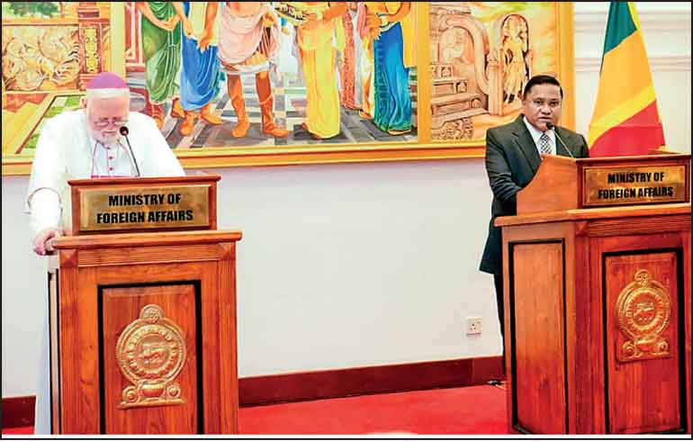 Archbishop Paul Richard Gallagher (left) with Foreign Affairs Minister Vijitha Herath at a joint press briefing in Colombo