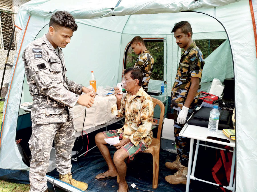 In flood-hit Indivitiya, Ja-Ela, the Aarogya Maitri BHISHM Cube that arrived in Sri Lanka on 30 November on board IAF C-130J aircraft turned an open space into a fully functional medical centre — delivering diagnostics and treatment where services had collapsed. The medical units are self-sufficient without even needing external power supply to function. Over 300 patients received medical support for injuries, dehydration and urgent conditions.