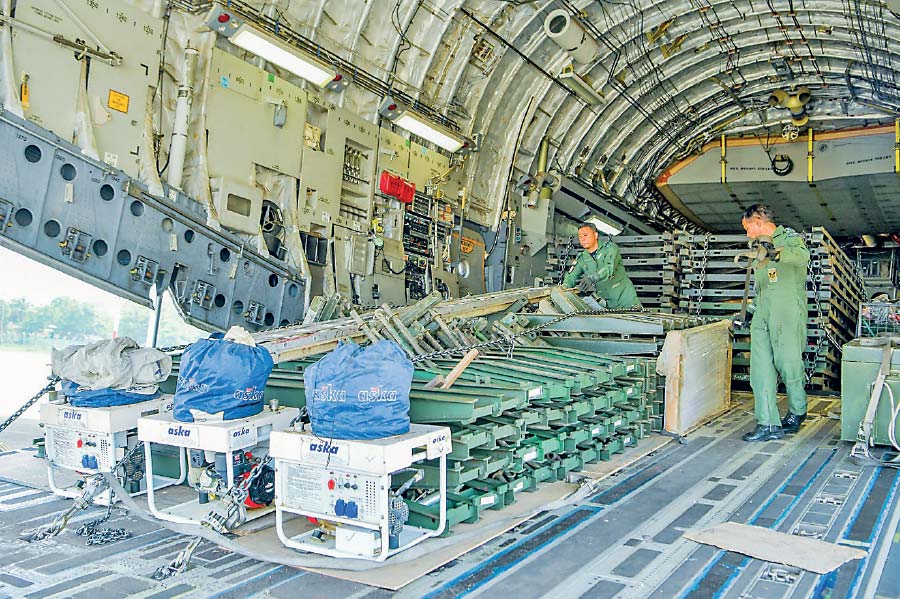 An Indian Air Force C-17 arrived in Sri Lanka yesterday with modular Bailey bridge components and a 25-member team to support recovery work following the floods and landslides.