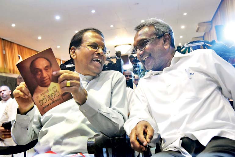 The launch of the book ‘Maa Akamathi J.R.’ (The J.R. I Disliked) based on the J.R. Jayewardene Memorial Lecture delivered by Imthiaz Bakeer Markar, along with its Tamil and English translations, was held yesterday at the J.R. Jayewardene Centre, Colombo 7. Here, former President Maithripala Sirisena (left) is seen with a copy of the book, sharing a lighter moment with Markar – Pic by Shehan Gunasekara