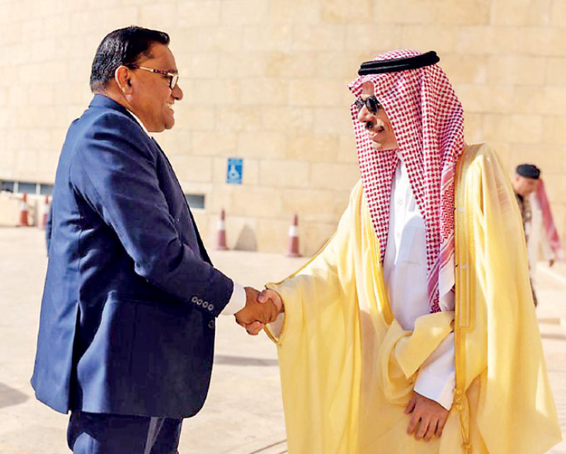 Foreign Affairs and Tourism Minister Vijitha Herath (left) meets Saudi Arabian Foreign Affairs Minister Prince Faisal bin Farhan Al Saud
