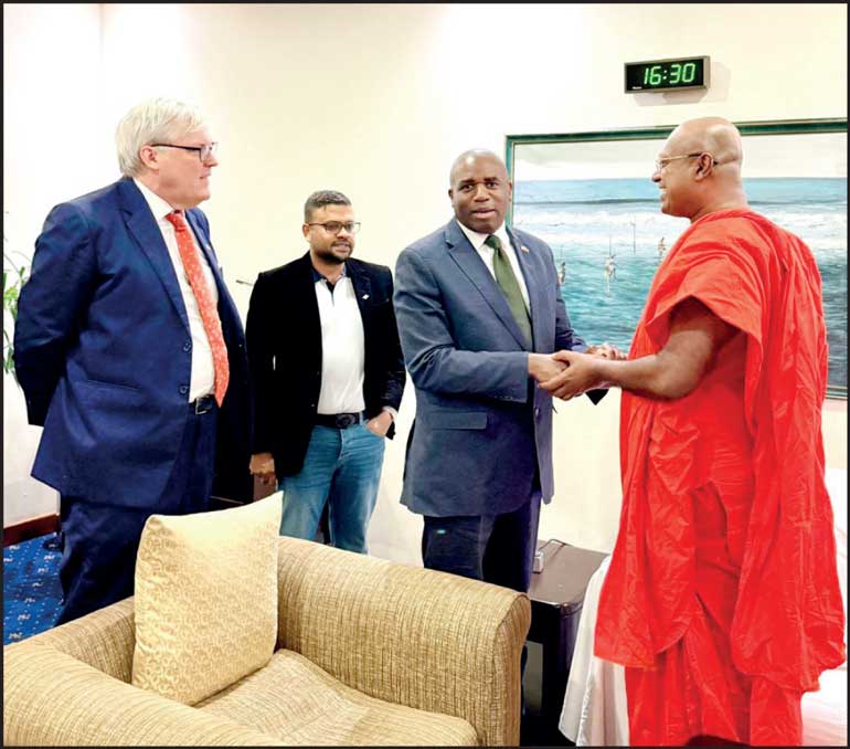 UK’s Deputy Prime Minister David Lammy met with Most Venerable Dr. Kirinde Assaji to discuss the importance of strengthening Sri Lanka-UK bilateral relations. British High Commissioner Andrew Patrick accompanied Lammy for the meeting. A meaningful dialogue focused on cooperation, mutual understanding, and future collaboration between Sri Lanka and the United Kingdom.