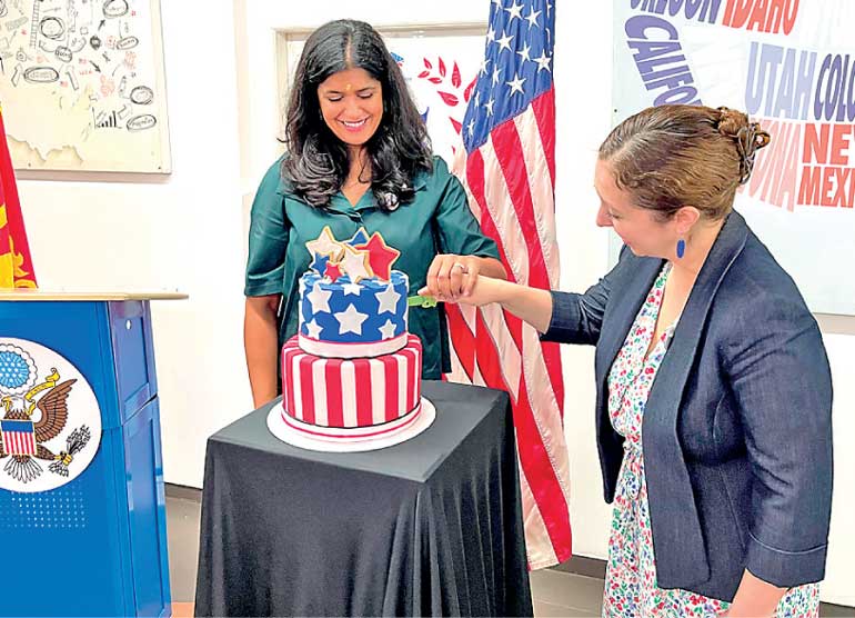 US Embassy in Sri Lanka Public Affairs Officer Menaka Nayyar (left) and Regional Public Engagement Specialist Miquela Burke at the anniversary event