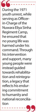 From his childhood, Jayasuriya displayed a deep interest in religion and the Dhamma. His education at Ananda College, together with his association with nationalist figures such as L.H. Mettananda, shaped his religious and cultural orientation from an early age. Between 1965 and 1972, he served as a disciplined military officer in several camps. During the 1971 youth unrest, while serving as Officer-in-Charge of the Nuwara Eliya Sinha Regiment Camp, he ensured that no young life was harmed under his command. Through his intervention and support, many young people were instead guided towards rehabilitation and reintegration, a legacy that reflects his enduring commitment to humanity and national reconciliation.