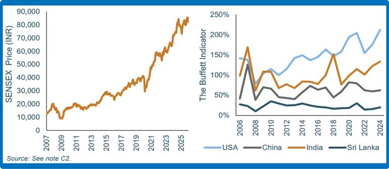 C2: Bloomberg, FactSet. SENSEX for period 31 Dec 2006 to 20 Jan 2026.  Buffett indicator – annual periods from 31 Dec 2006 to 31 Dec 2005. Buffett indicator is market cap divided by GDP.