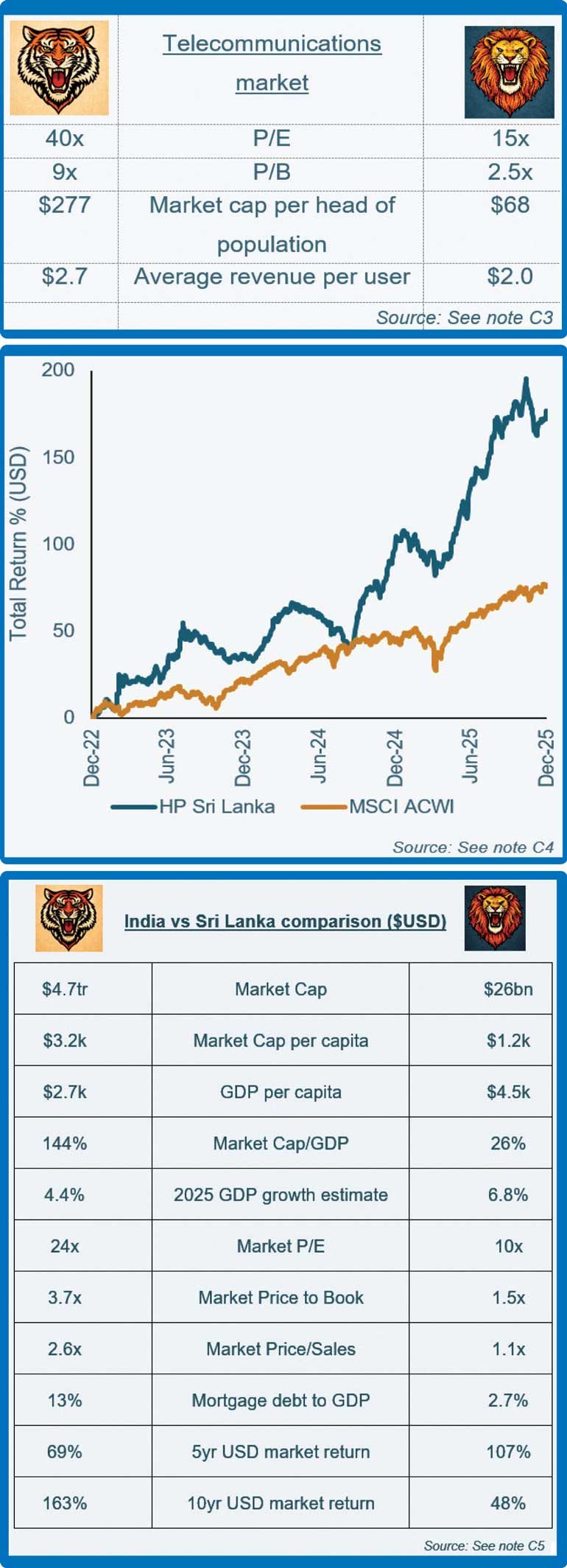 • First, the cyclical economic recovery from the trauma of the 2022 default and subsequent bail-out reforms is likely to continue, to the benefit of major corporates. Many of the survivor businesses, for instance our investments in Dialog Axiata, John Keells, Aitken Spence and Lion Brewery, did not let the crisis go to waste. Mergers, capacity closures and foreign competitor exits have materially improved forward-looking returns for these new now dominant franchises.