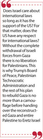 As a result, not only that Israel is now controlling nearly 58% of Gaza’s land area after the ceasefire but has gone further by de facto annexation of parts of the West Bank through land registration which has turned into de jure with provision of consular services to the settlers. All these developments in the West Bank are illegal under the 1967 accord. But does Israel care about international laws so long as it has the support of the US? For that matter, does the US have any respect for international laws? Without the complete withdrawal of Israeli forces from Gaza there is no liberation for Palestinians. This is why Trump’s Board of Peace, Palestinian Technocratic Administration and the rest of his plan to rebuild Gaza is no more than a camouflage before handing over the reconstructed Gaza and entire Palestine to Eretz Israel.