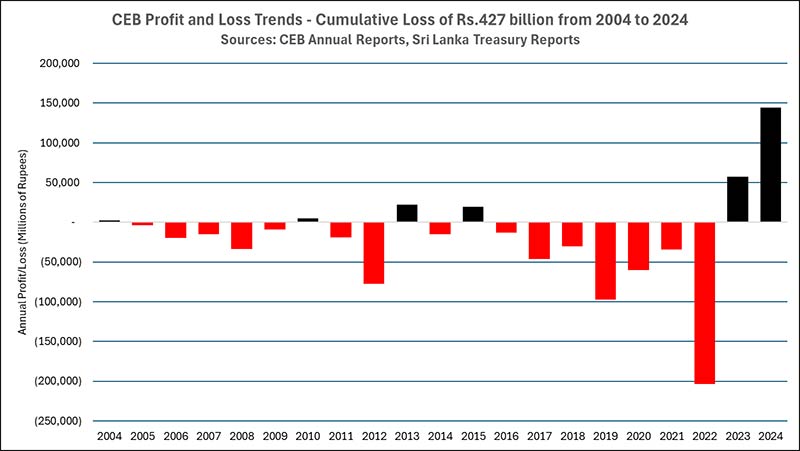 The CEB is a massive corporation with 2024 revenues of LKR 547 billion (~$1.8 billion). It rivals corporate giants like MAS, Brandix, Hayleys and John Keells. But, until IMF Extended Fund Facility (EFF) program imposed a requirement for cost reflective tariffs, CEB was frequently loss making with cumulative losses from 2004 to 2024 of about Rs. 427 billion (see Figure 1).