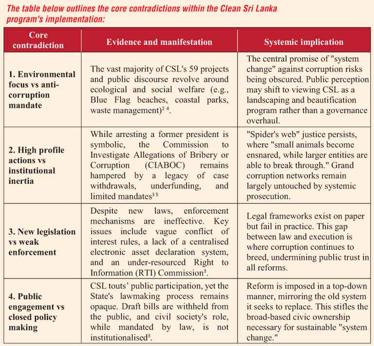 FOLLOWING a historic electoral victory, Sri Lanka's National People's Power (NPP) Government came to power with an electrifying promise: "system change." At the heart of this pledge lies "Clean Sri Lanka" (CSL), a flagship program touted as the operational arm of a new social contract grounded in anti-corruption, transparency, and the rule of law 1. As it rolls into a new year with an expanded budget of Rs. 6,500 million for 2026, a critical examination reveals a complex and contradictory reality. While CSL demonstrates political will and delivers visible environmental projects, its effectiveness as a tool to dismantle deep-rooted corruption is being hampered by a strategic overreach and unaddressed systemic flaws2 3.
