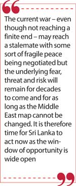 The current war – even though not reaching a finite end – may reach a stalemate with some sort of fragile peace being negotiated but the underlying fear, threat and risk will remain for decades to come and for as long as the Middle East map cannot be changed. It is therefore time for Sri Lanka to act now as the window of opportunity is wide open. Imagine what Sri Lanka could be in two to three decades.