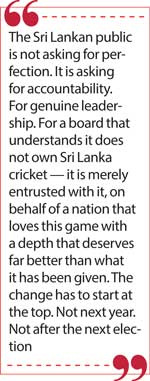 Accountability to the fans who fund this sport through tickets, merchandise, and the taxes that build and maintain facilities. Accountability to the sponsors who invest in the brand. Accountability to the government — of whatever political stripe — that implicitly backs the institution with its endorsement. Accountability to the thousands of young cricketers across this country, from Galle to Jaffna, who dream of wearing the lion on their chest.