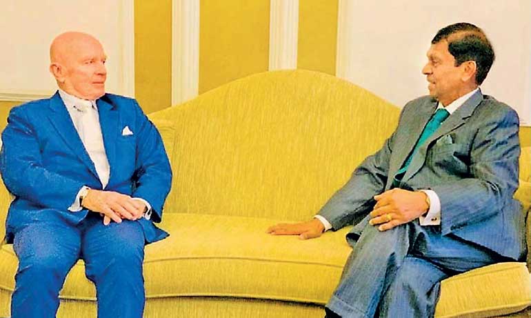Dr. Mark Mobius (left) with the writer Nivard Cabraal during a meeting in Colombo (File photo)