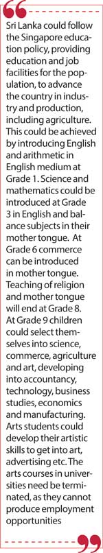Sri Lanka could follow the Singapore education policy, providing education and job facilities for the population, to advance the country in industry and production, including agriculture. This could be achieved by introducing English and arithmetic in English medium at Grade 1. Science and mathematics could be introduced at Grade 3 in English and balance subjects in their mother tongue. At Grade 6 commerce can be introduced in mother tongue. Teaching of religion and mother tongue will end at Grade 8.