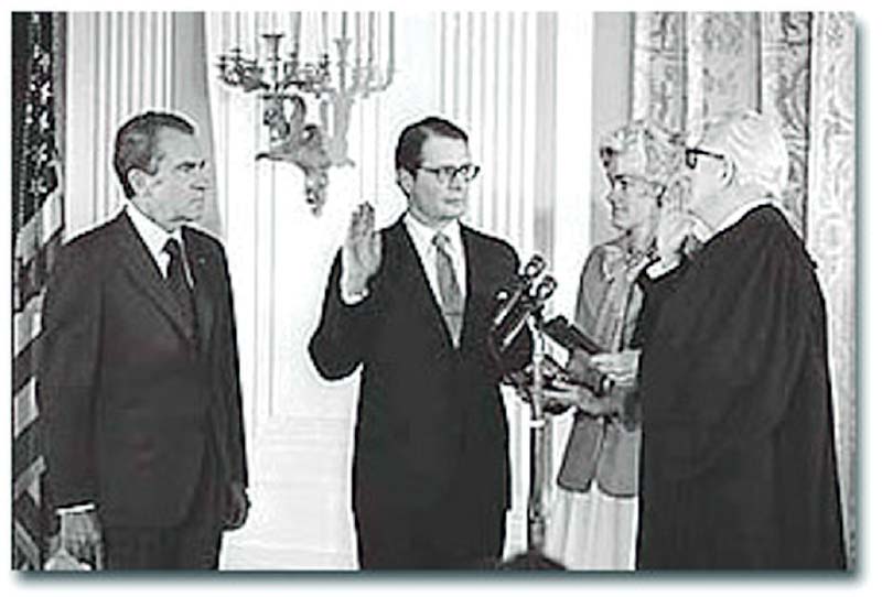 Elliot Richardson is sworn in as Secretary of Defence in February of 1973. President Nixon looks on as Richardson’s wife, Anne, holds the Bible and Chief Justice Warren Burger swears him in at the White House