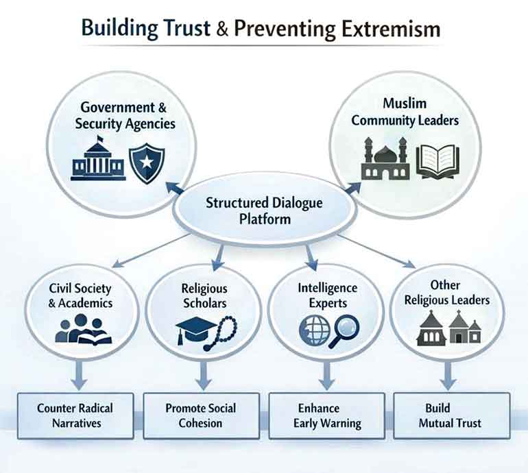 What Sri Lanka currently lacks is a structured, institutionalised platform for sustained engagement between the Government, security sector, and Muslim community leadership. Dialogue, when it occurs, is often reactive triggered by crises rather than embedded as a preventive mechanism. This absence creates space for misinterpretation, misinformation, and external influence operations to shape both public opinion and intra-community dynamics.