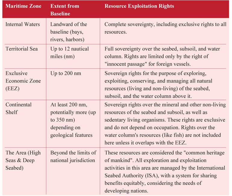 Sri Lanka can inter alia exploit all valuable sea resources within its territorial jurisdictional rights, including those secured under the United Nations Convention on the Law of the Sea (UNCLOS), which paves the way for the rights of nations to exploit under-sea resources, of course varying by maritime zones.