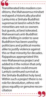Embracing Mahawamsa and shoving Dipawamsa to obscurity, enabled the creation of the myth of Lanka as the holy land of (Sinhala) Buddhism in relentless contestation with alien invaders for Sinhala-Buddhist Lebensraum (living space) as well as the concept of ‘sinless/meritorious war’ (waged for the protection of Buddhism, against enemies who are ‘unbelievers and men of evil life’). Transliterated into modern conditions, the Mahawamsa mindset reshaped a historically pluralist Lanka into a Sinhala-Buddhist supremacist land in which the minorities are not co-owners but guests, at best tolerated. Mahawamsa’s anti-Buddhist idea of killing in order to save Buddhism has been used by politicians and political monks alike to justify violence against this or that minority for decades. Rajapaksas appropriated this neo-Mahawamsa project and added to it the notion that only Rajapaksa rule could ensure Lanka’s continued survival as the Sinhala-Buddhist holy land. Within such a project there is no role for devolution, ethno-religious equality or genuine reconciliation.