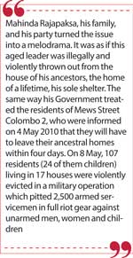 Mahinda Rajapaksa, his family, and his party turned the issue into a melodrama. It was as if this aged leader was illegally and violently thrown out from the house of his ancestors, the home of a lifetime, his sole shelter. The same way his Government treated the residents of Mews Street Colombo 2, who were informed on 4 May 2010 that they will have to leave their ancestral homes within four days. On 8 May, 107 residents (24 of them children) living in 17 houses were violently evicted in a military operation which pitted 2,500 armed servicemen in full riot gear against unarmed men, women and children.