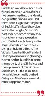 Contrary to popular myths, Buddhism flourished in South India long after its decline in North India. The teachings of Gautama Buddha are neither tribalistic nor martial. Buddhism could have been a unifying factor in Sri Lanka, if it had not been turned into the identity badge of the Sinhala race. Had there been a significant segment of Buddhist Tamils, with a voice within the Sangha, Sri Lanka’s post-Independence history may have taken a less destructive path. But to be able to appeal to Tamils, Buddhism has to cease being Sinhala-Buddhism. The Vidyalankara tradition President Disanayake invokes so glowingly is premised on Buddhism being the property of the Sinhalese and the supremacy of this Sinhala-Buddhism. It is the same tradition which eventually birthed Galagoda-Atte Gnanasara and other Rajapaksa monks.