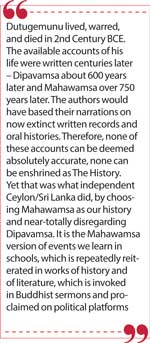 Dutugemunu lived, warred, and died in 2nd Century BCE. The available accounts of his life were written centuries later – Dipavamsa about 600 years later and Mahawamsa over 750 years later. The authors would have based their narrations on now extinct written records and oral histories. Therefore, none of these accounts can be deemed absolutely accurate, none can be enshrined as The History. Yet that was what independent Ceylon/Sri Lanka did, by choosing Mahawamsa as our history and near-totally disregarding Dipavamsa. It is the Mahawamsa version of events we learn in schools, which is repeatedly reiterated in works of history and of literature, which is invoked in Buddhist sermons and proclaimed on political platforms.