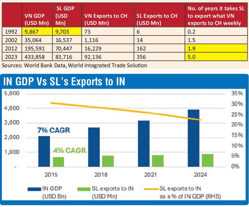The story of Sri Lankan exports vis ASEAN is also one of a "composition problem." While ASEAN nations have spent the last two decades plugging themselves into the Chinese supply chain and each other (mobile phones and related parts, Integrated Circuits, Machine parts, fruits and staples at scale, rubber and plastics for the Chinese automotive and consumer goods industries), Sri Lanka has stayed largely with a 20th-century product mix that simply cannot match up to the new trend. The disparity is now so vast that a neighbour like Vietnam which had a similar GDP to Sri Lanka three decade ago now exports more to China in one week than Sri Lanka does in five years.
