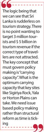 The logic being that we can see that Sri Lanka is rudderless on tourism strategy. There is no point wanting to target 3 million tourists and $ 5 billion in tourism revenue if the correct type of travellers are not attracted. The key concept that must govern policy making is “carrying capacity”. What is the optimum carrying capacity that key sites like Sigiriya Rock, Yala or Horton Plains can take. We need issue based policy making rather than structural reform as time is ticking.
