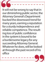It will not be wrong to say that in our diminishing public sector, the Attorney General’s Department bucked the downward trend for many years, earning a reputation for a sturdy independence and reliable competence. The concept of this office has inherent safety valves; its officers are reasonably sheathed from undue interference; they turn a deaf ear to mass hysteria and in its internal processes an officer’s independent professionalism carries value. The career path of an officer of the Department eventually leads to judicial office or a practice in the private bar, a good reputation and well-honed skills help in either path.