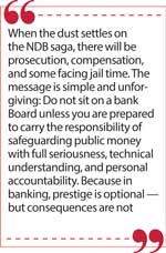 Ultimately, banks survive on one fragile asset: trust. Depositors do not read Annual Reports. They trust that someone competent is reading them on their behalf. When that trust is betrayed through negligence or ignorance, the damage is not just financial — it is systemic. When the dust settles on the NDB saga, there will be prosecution, compensation, and some facing jail time. The message is simple and unforgiving: Do not sit on a bank Board unless you are prepared to carry the responsibility of safeguarding public money with full seriousness, technical understanding, and personal accountability. Because in banking, prestige is optional — but consequences are not.