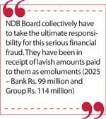 The NDB Board collectively have to take the ultimate responsibility for this serious financial fraud. They have been in receipt of lavish amounts paid to them as emoluments (2025 – Bank Rs. 99 million and Group Rs. 114 million). Their prime duty is to safeguard the funds of shareholders which they have failed to do. They owe a duty of care to the shareholders. The Companies Act provides that the standard of care, skill and diligence exercised by a director is that which may be expected of a person possessing knowledge and expertise as him or herself. Some of the directors may have to take individual responsibility taking into consideration the knowledge and expertise possessed by them and depending on the role played by them in the Committees of the Board.