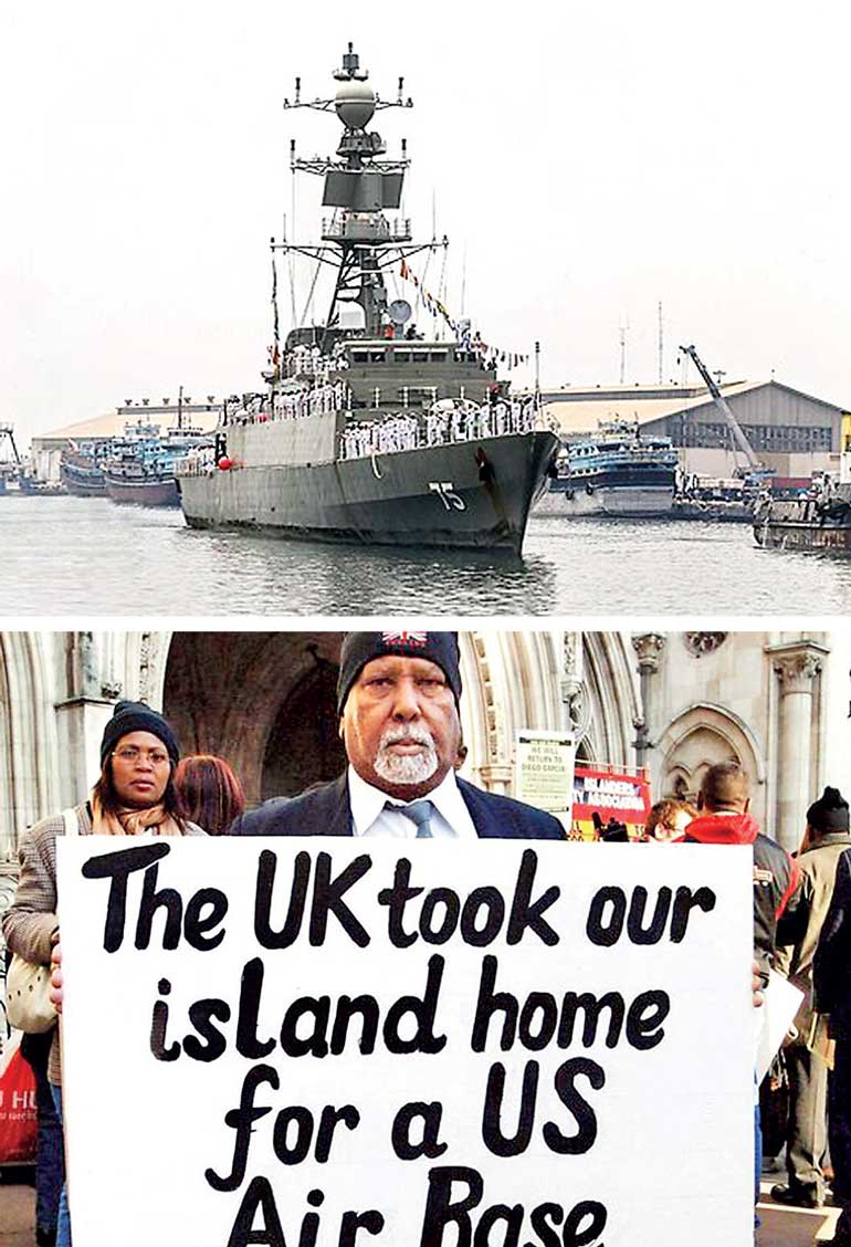 Protests outside the British Courts in London over the US-UK illegal Occupation of the Chagos Islands where there is a huge military base, Diego Garcia, which is located near the Maldives and Sri Lanka. A US Submarine attacked the Iranian Frigate ISIS Dena killing 87 sailors and causing environmental damage in Sri Lanka’s Exclusive Economic Zone.