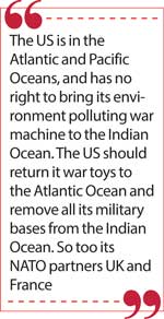 The US is in the Atlantic and Pacific Oceans, and has no right to bring its environment polluting war machine to the Indian Ocean. The US should return it war toys to the Atlantic Ocean and remove all its military bases from the Indian Ocean. So too its NATO partners UK and France.