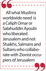 Two billion Muslims worldwide and fifty five Arab and Muslim rulers couldn’t lift a finger to open it. This is the shameful state of affairs in the Muslim world. Under the circumstance all what Muslims worldwide need is a Caliph Omar or Salahuddin Ayoubi who liberated Jerusalem and not Shaikhs, Salmans and Sultans who collaborate with Zionist occupiers of Jerusalem.
