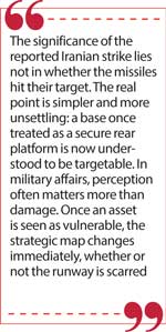 The significance of the reported Iranian strike lies not in whether the missiles hit their target. Reuters, citing the Wall Street Journal, reported that two intermediate-range ballistic missiles were fired at the base, that one failed in flight, and that a US warship launched an SM-3 interceptor at the other, though the outcome of that interception remained unclear. The real point is simpler and more unsettling: a base once treated as a secure rear platform is now understood to be targetable. In military affairs, perception often matters more than damage. Once an asset is seen as vulnerable, the strategic map changes immediately, whether or not the runway is scarred.